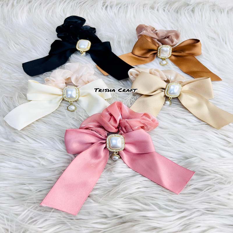 Women Sweet Chiffon Pearl Bow Oversized Hair Bands / Girls Elegant Ponytail Hair Scrunchies / Ladies Hair Clp
