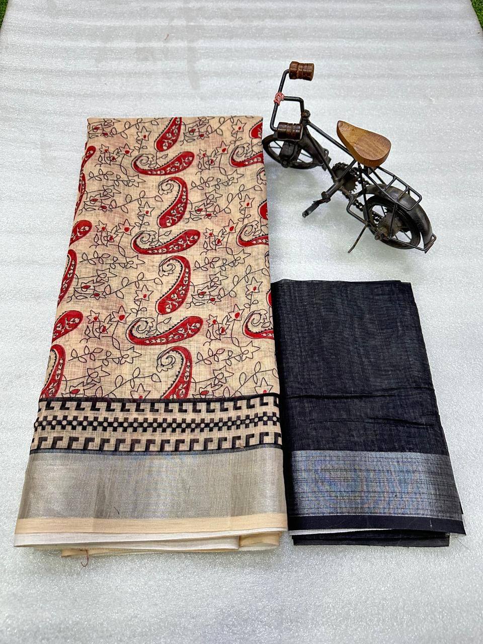 Fabric: Linen saree with beautiful Digital Printed pallu Silver jari Weaving border